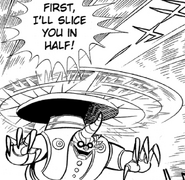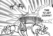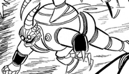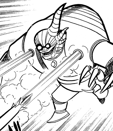 Mecha Gohonki was capable of flight and could fire missiles from its stomach. It had long talon-like fingers and a large retractable buzz-saw coming out from its back.